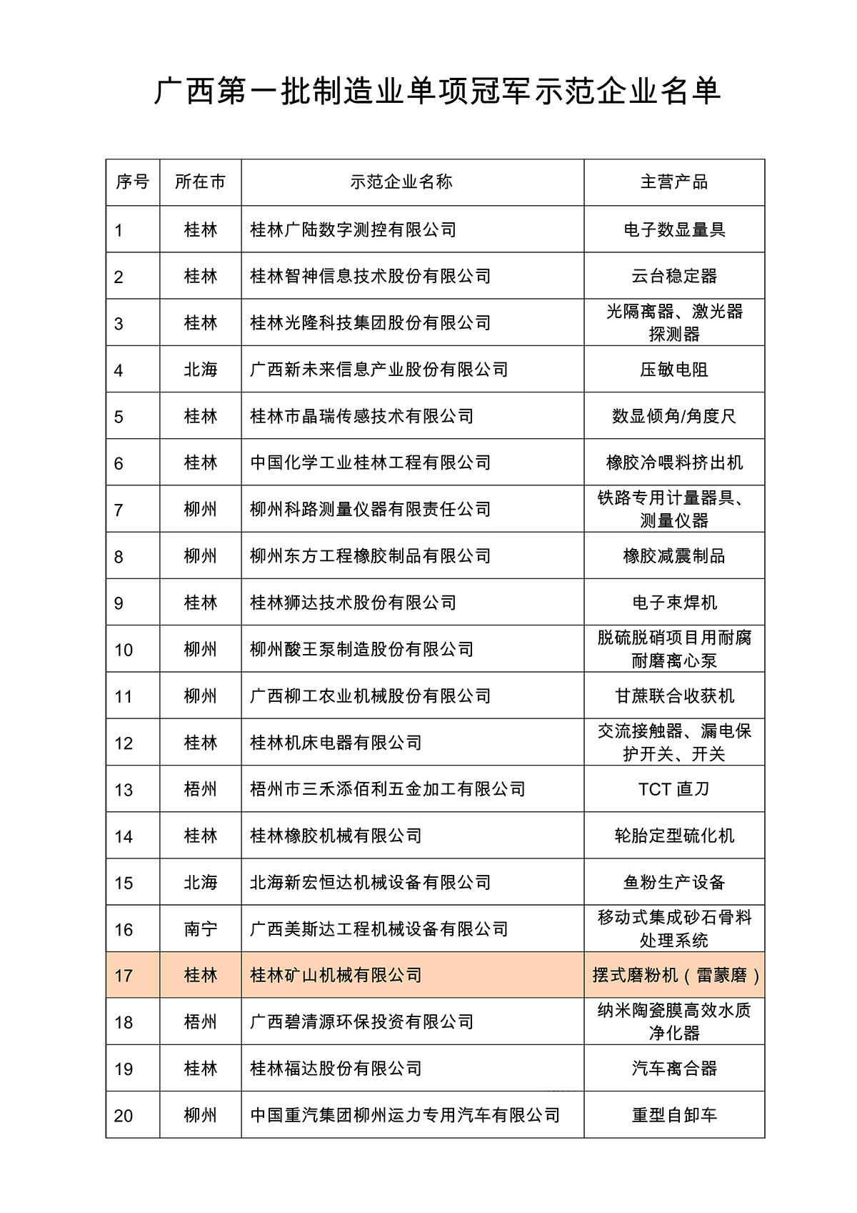 日前(qian),自治區工業和信(xìn)息化廳關于印發(fa)廣西第一批制造(zào)業單項冠軍企業(yè)名單的通知,确定(ding)了桂林礦機等42家(jiā)企業成功入選廣(guǎng)西第一批制造業(yè)單項冠軍示✨範企(qǐ)業。